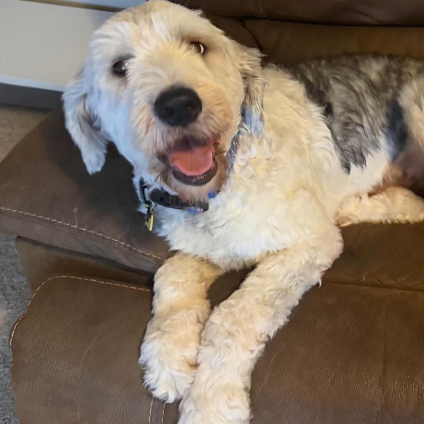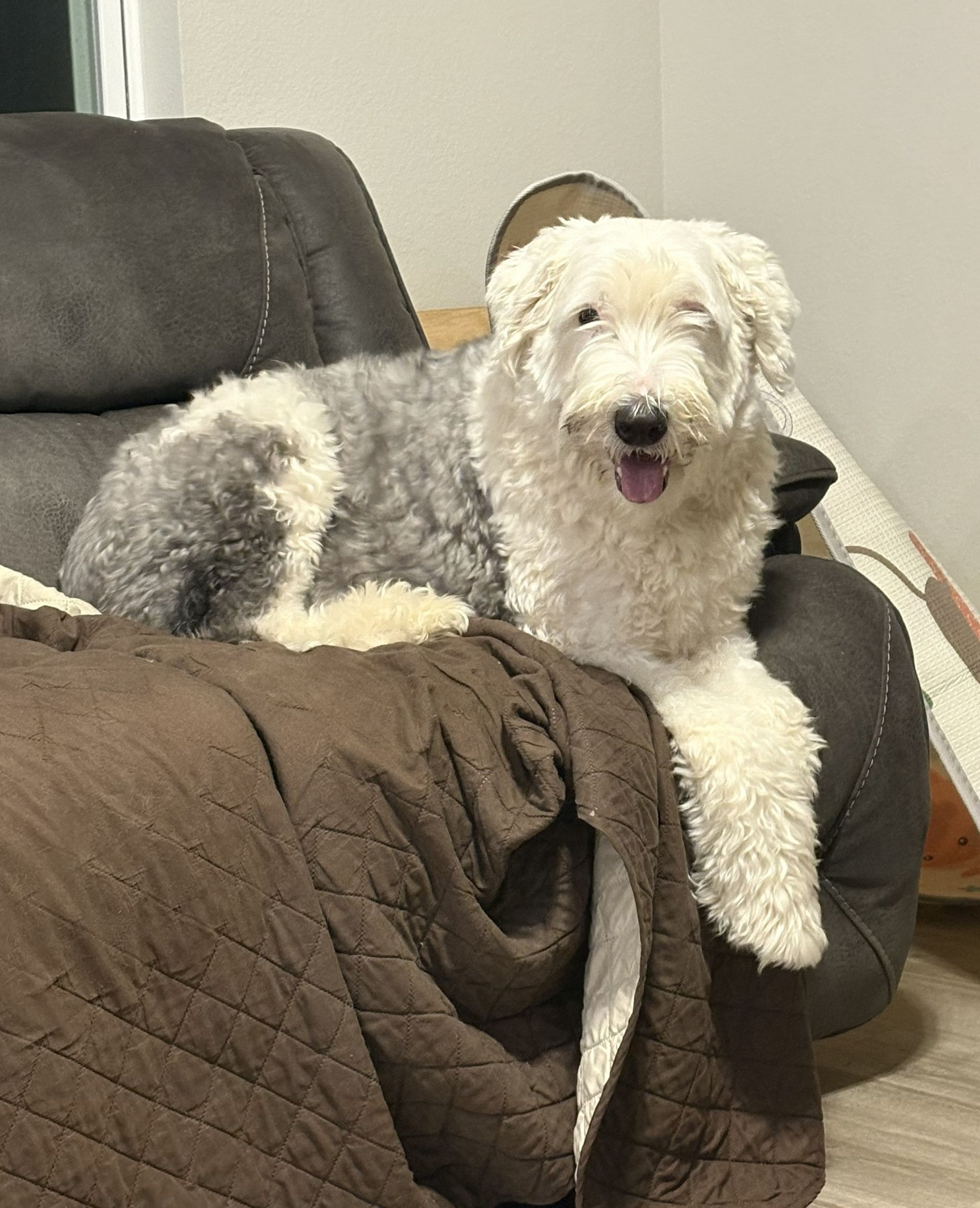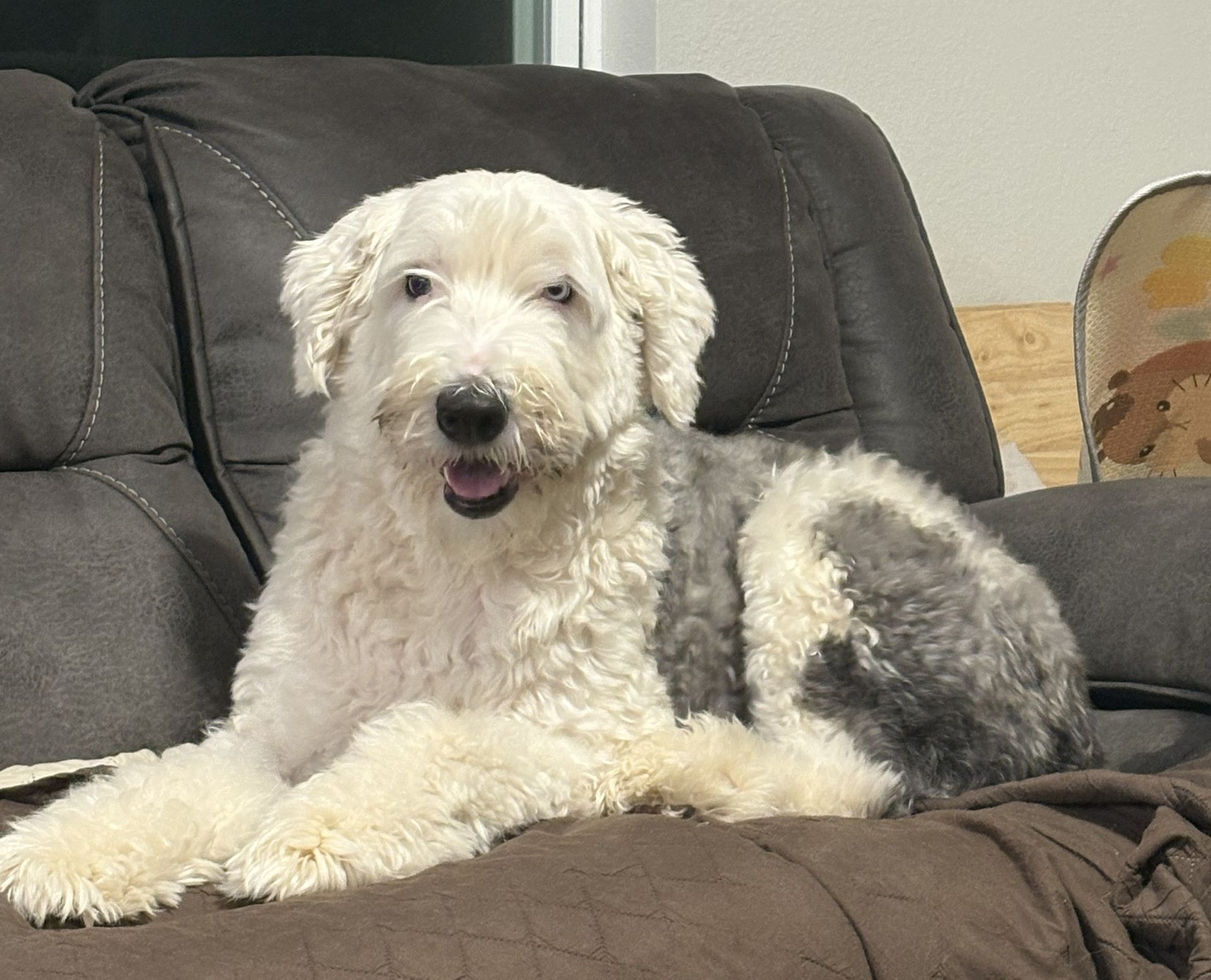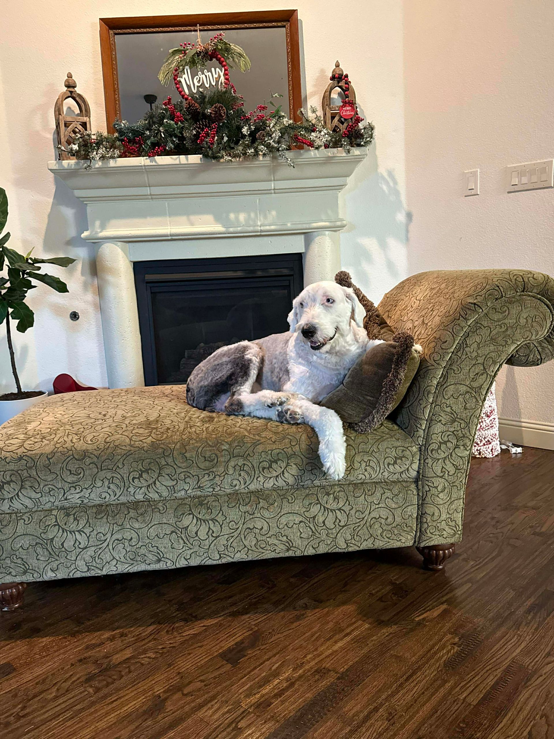 Max is a 5-year-old neutered male OES. He loves to play, play, play, walk, walk, walk, and hang out in the backyard followed by snuggles on the couch at the end of the day.