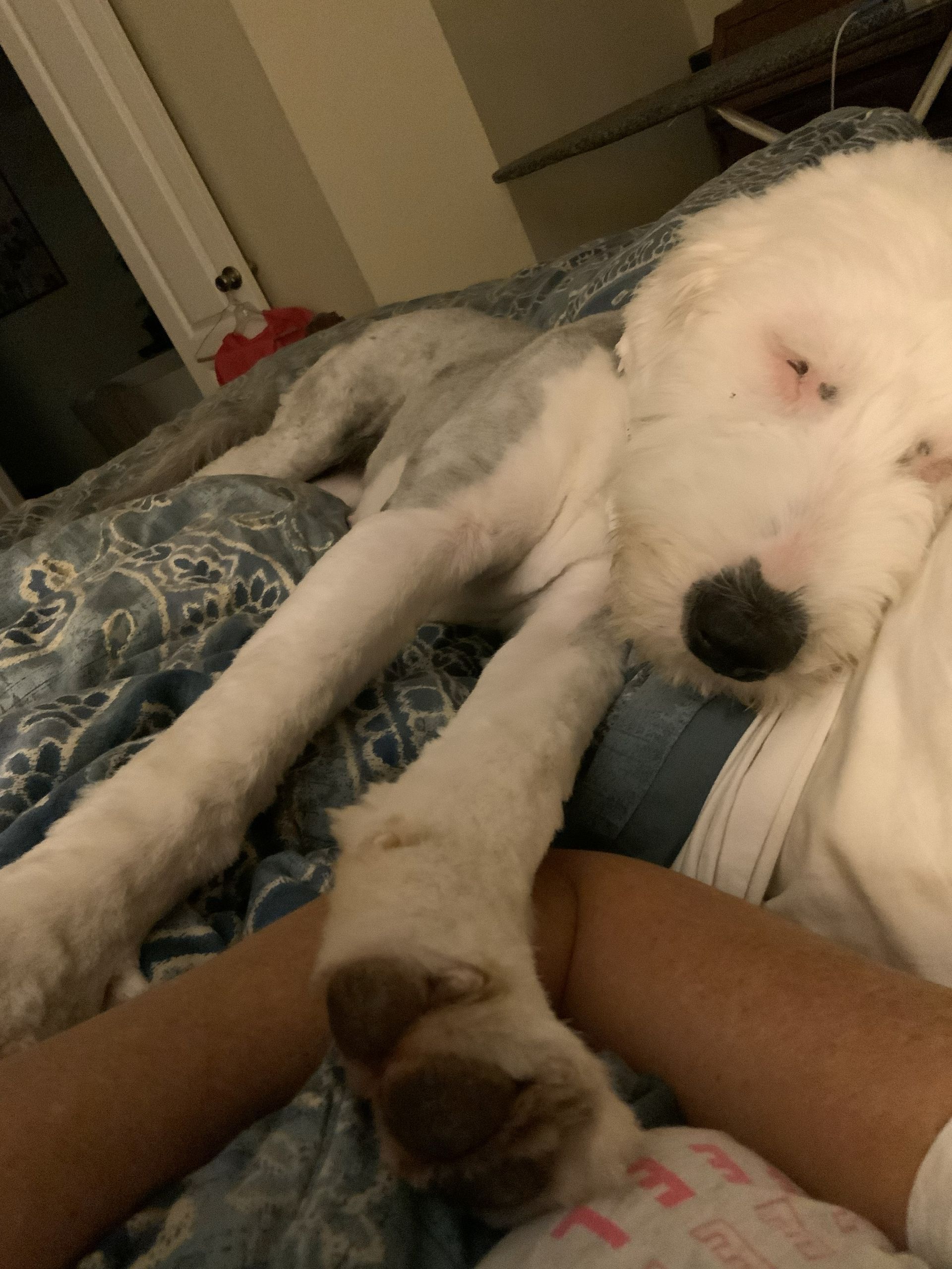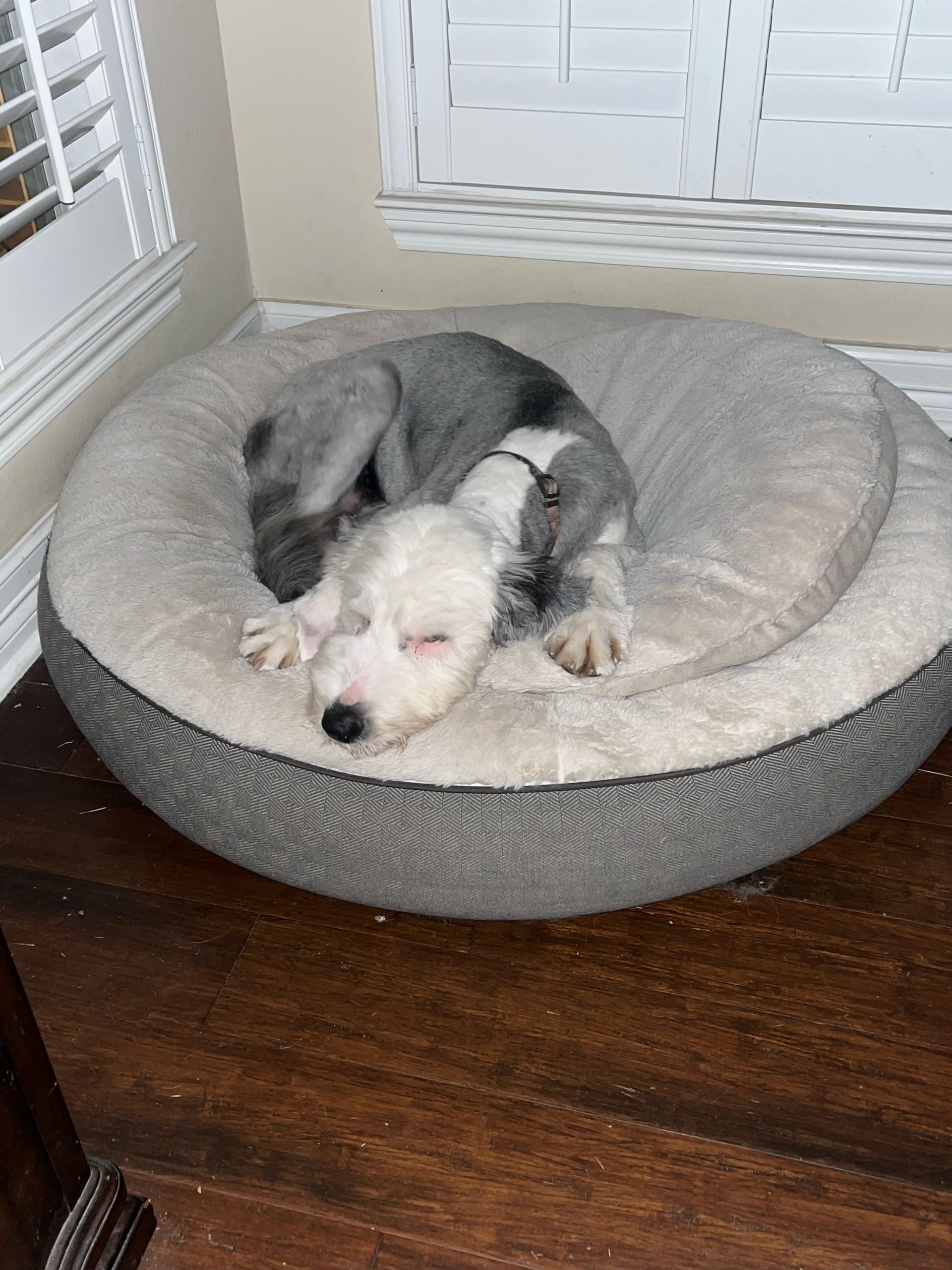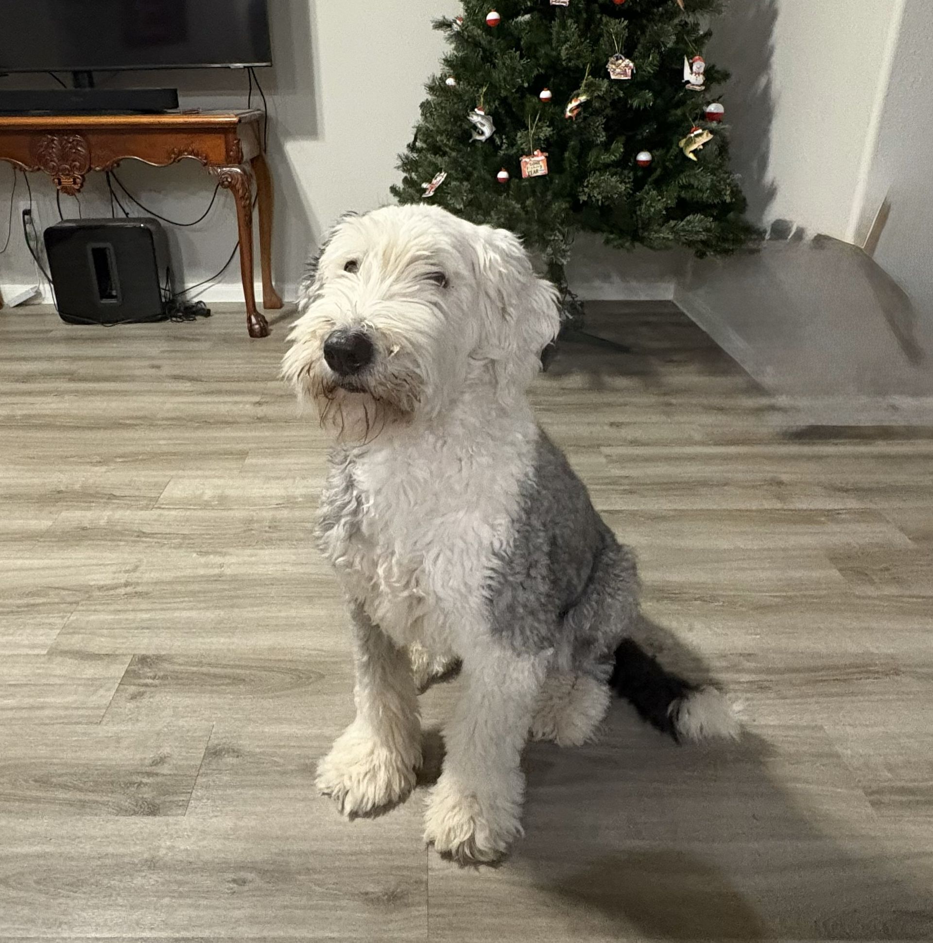 Max is a 5-year-old neutered male OES. He loves to play, play, play, walk, walk, walk, and hang out in the backyard followed by snuggles on the couch at the end of the day.