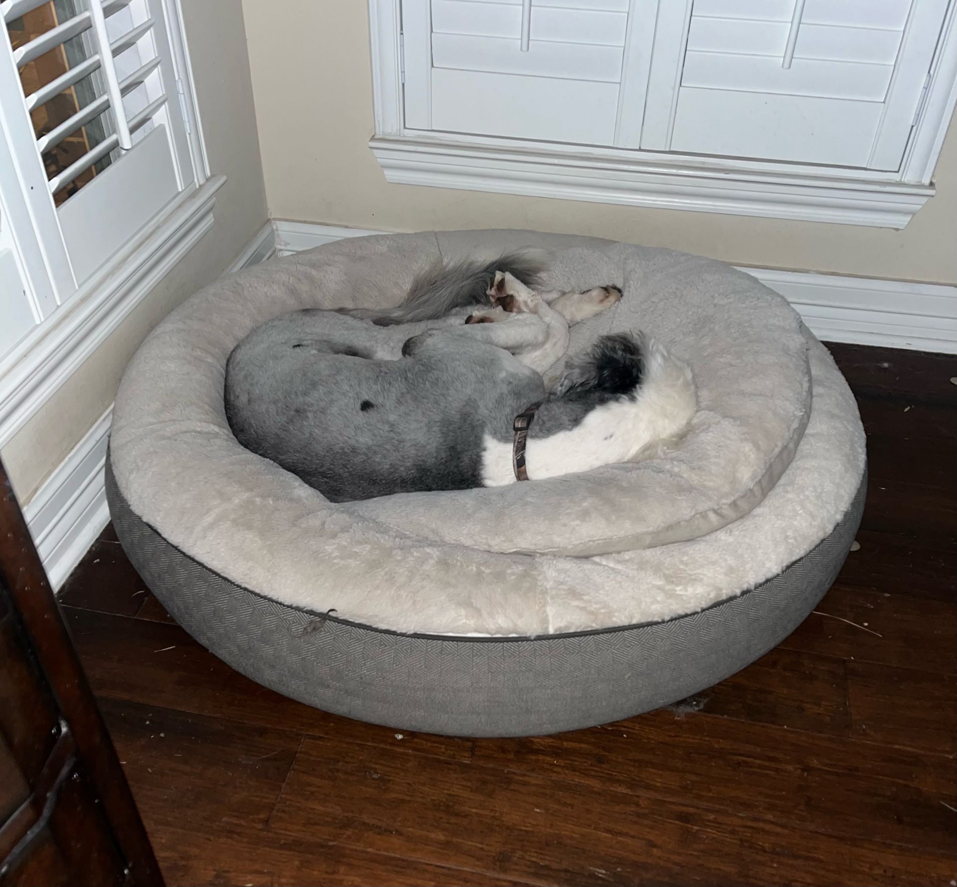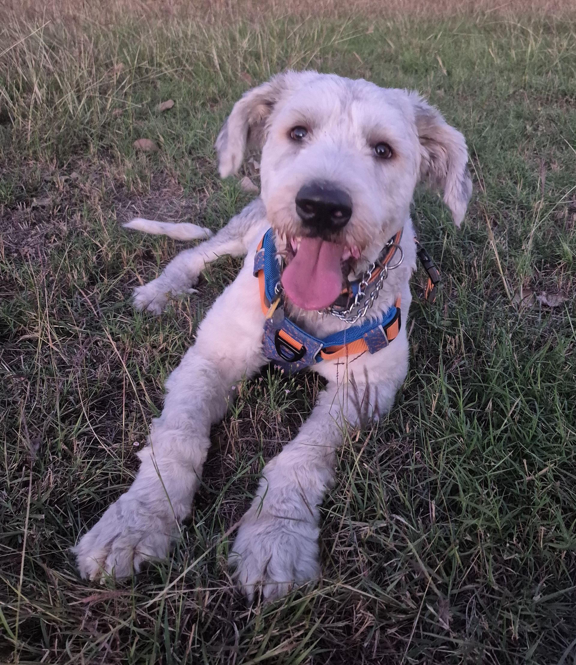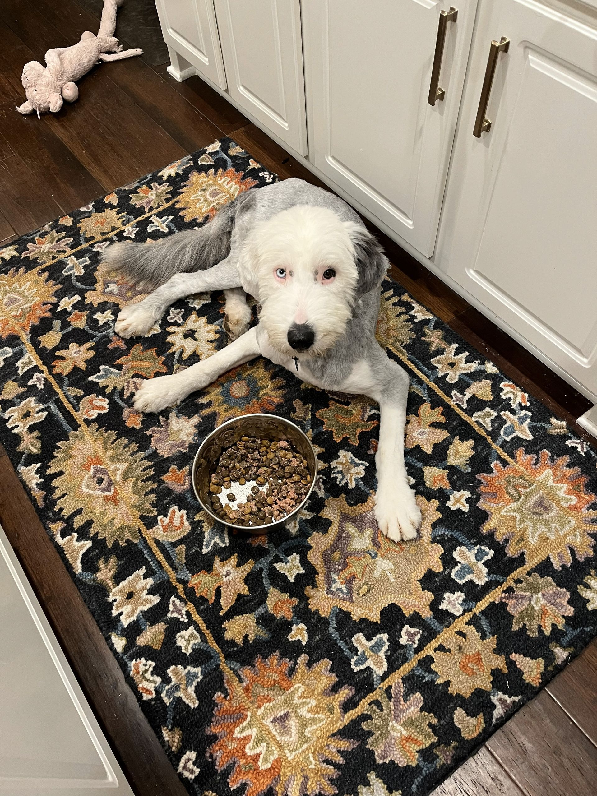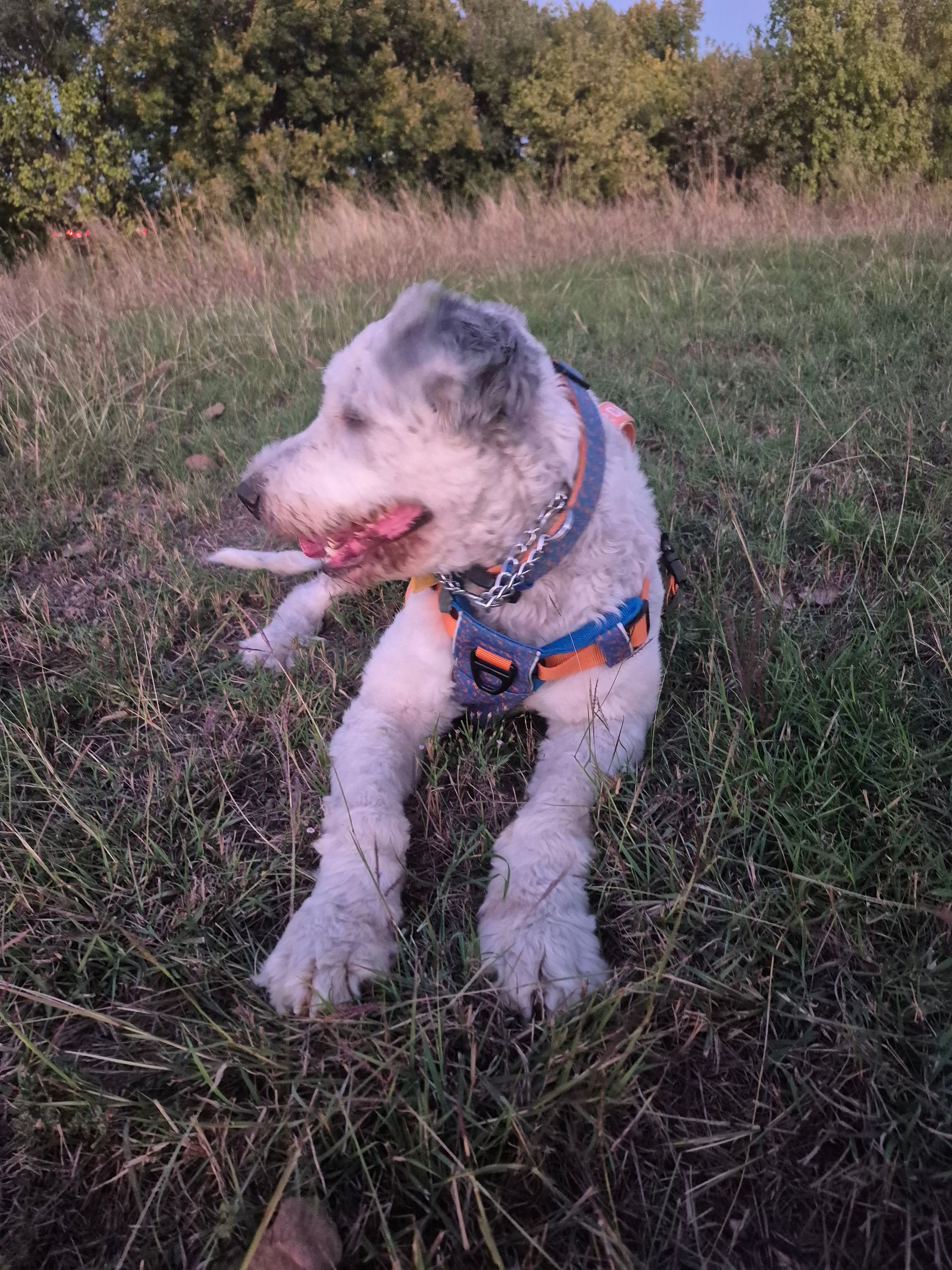 Max is a 5-year-old neutered male OES. He loves to play, play, play, walk, walk, walk, and hang out in the backyard followed by snuggles on the couch at the end of the day.